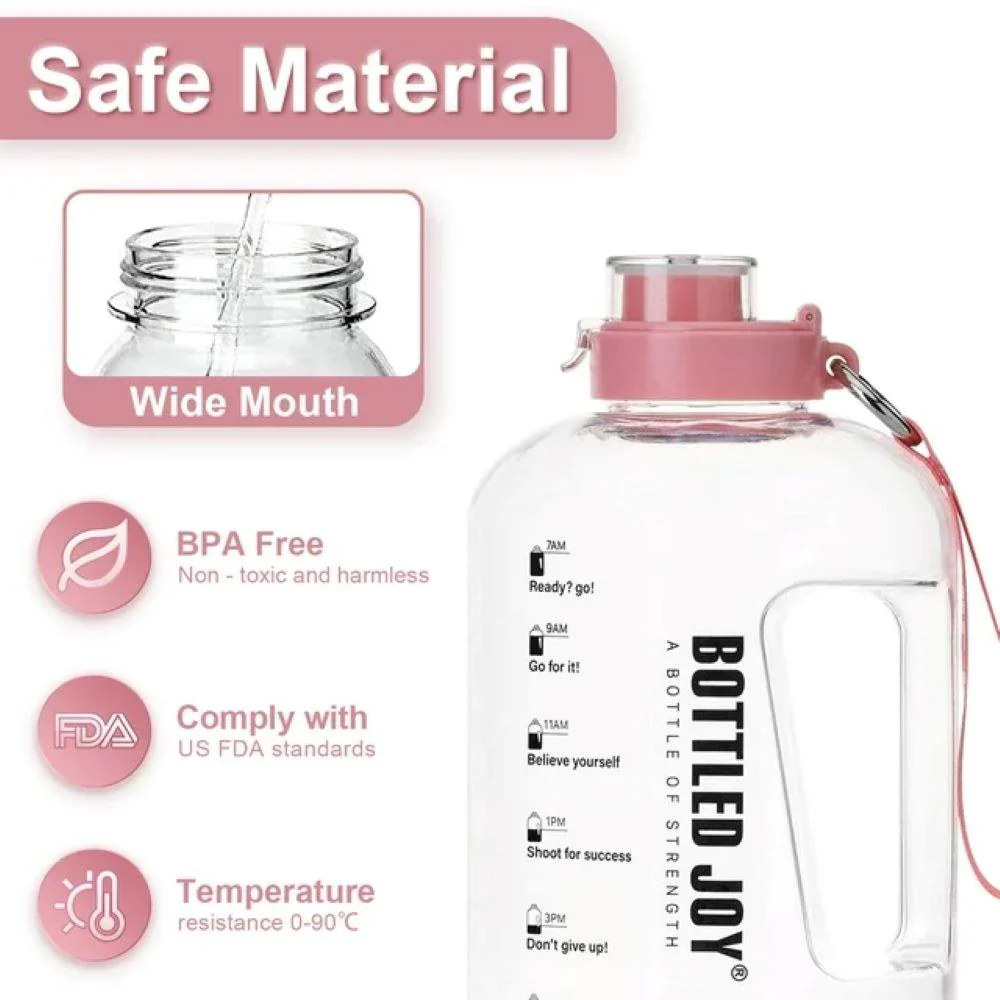 Quench your thirst and stay hydrated with the Bottled Joy® water bottle, designed to simplify your hydration routine. Holding a generous 85 oz of water, it minimizes the need for constant refills, letting you focus on staying hydrated throughout the day. Crafted from 100% BPA-free plastic, this bottle ensures your water remains clean and safe to drink. Its eco-friendly and leak-proof design makes it a reliable companion wherever you go. Featuring hourly time markers, it helps you track and boost your daily water intake effortlessly. The large side handle makes it easy to carry, while the 1.5" wide mouth opening allows for easy cleaning, addition of supplements, or insertion of ice. Embrace hydration with convenience and sustainability in mind. Hand wash only for best care.